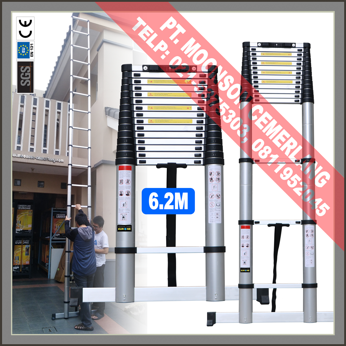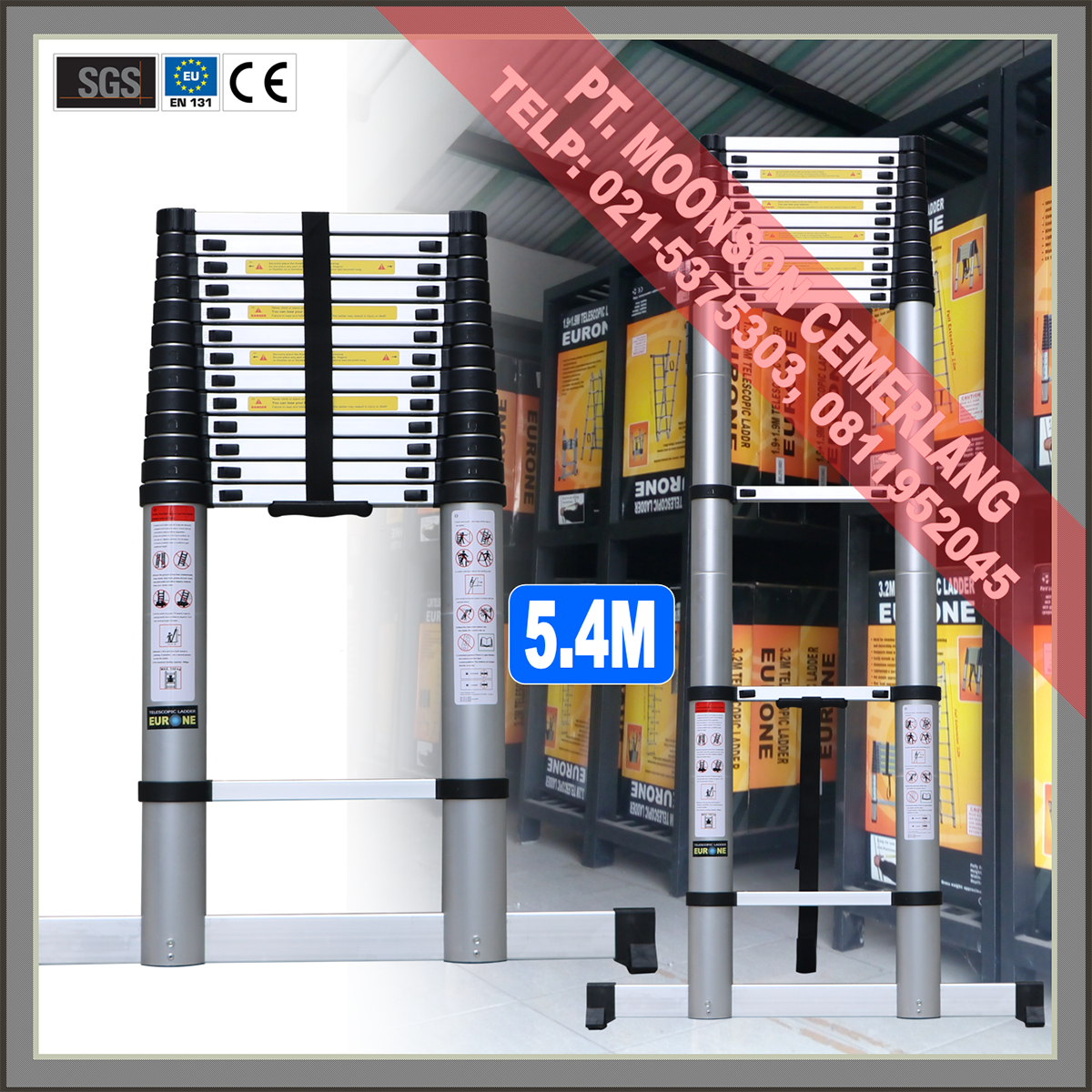 Bagi anda yang mencari tangga teleskopik 5m, kami sediakan pilihan tangga teleskopik 5.4m. Ketinggiannya dua anak tangga lebih rendah dari yang 6.2m. Semuanya dari produk yang sama, yaitu Eurone X-tra. Kami rekomendasikan untuk para profesional yang memang cukup dengan ketinggian tangga ini untuk menggunakannya. Kelebihan dari tangga teleskopik 5.4m Eurone X-tra adalah bukan saja soal overlapping tube yang lebih panjang dari yang standar dan dukungan bottom bar, tetapi yang juga tak kalah pentingnya adalah penggunaan pipa yang jauh lebih besar daripada tangga teleskopik lurus pada umumnya. Tangga teleskopik 5.4m Eurone X-tra sengaja menggunakan pipa terkecil pada bagian paling atas berdiameter 3.6 cm. Sedangkan tangga teleskopik lurus pada umumnya menggunakan pipa terkecil berdiameter 2.8 cm hingga paling besar 3.2 cm. Dengan demikian tangga 5.4m Eurone X-tra ini jauh lebih kokoh dan kuat di kelasnya. Bila ingin melihat postingan lain dengan topik yang sama sebagai tambahan informasi, silahkan KLIK DISINI. Berikut adalah video untuk memberikan gambaran jelas secara visual: