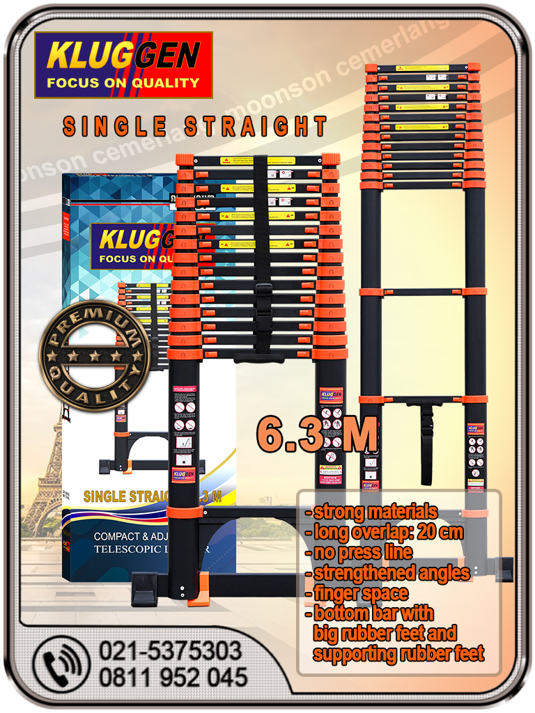 Terdapat dua pilihan tipe tangga lipat 6 meter jenis teleskopik ini, yaitu tipe single straight (lurus) dan tipe multipurpose (bisa segitiga dan bisa lurus). Untuk para profesional seperti petugas Telkom dan PLN, sangat dianjurkan untuk menggunakan tipe single straight karena lebih ringan, lebih praktis, lebih kuat, dan lebih murah pula. Namun demikian hati-hati dalam memilih produk tangga lipat teleskopik 6 meter karena tidak semuanya bisa dipanjat sampai puncak karena banyak yang goyang dan melengkung parah sehingga sangat mengerikan dan membahayakan. Untuk itu kami rekomendasikan untuk menggunakan produk dengan kualitas premium, dimana gelang-gelang pengikat tangga terbuat dari material yang super kuat dan menggunakan overlapping tube yang sangat panjang. Dengan demikian tidak ada mengenal gelang-gelang tangga pecah dan tangga goyang serta melengkung parah saat dipanjat seperti pada umumnya yang ada di pasaran. Tangga lipat 6 meter tsb. adalah merek Kluggen- tepatnya single straight 6.3m Kluggen (klik VIDEO)- spesifikasi lengkap bisa ke link Tokopedia atau Shopee.