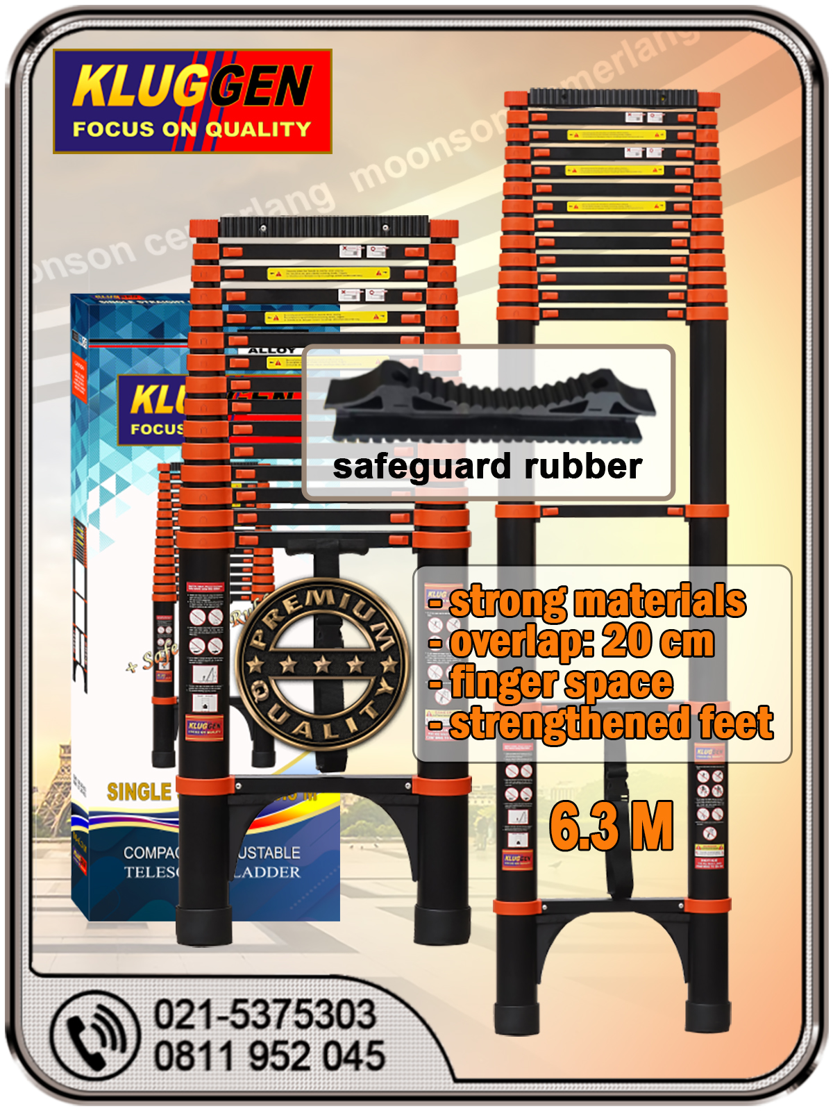 Tangga lipat 6 meter single straight (lurus) Kluggen ini tersedia dalam 2 pilihan. Pertama yang dilengkapi karet atas pengaman (safeguard rubber) pada bagian atasnya agar dapat mengurangi resiko tangga bergeser dari tiang yang dipanjat- seperti pada gambar pertama di atas (KLIK DISINI untuk detail). Kedua, yang dilengkapi palang bawah yang lebar (bottom bar) yang berfungsi agar menjaga tangga lebih stabil saat dipanjat- sperti terlihat pada gambar kedua di halaman ini. Lihat juga (klik) VIDEO SHORT-nya.
