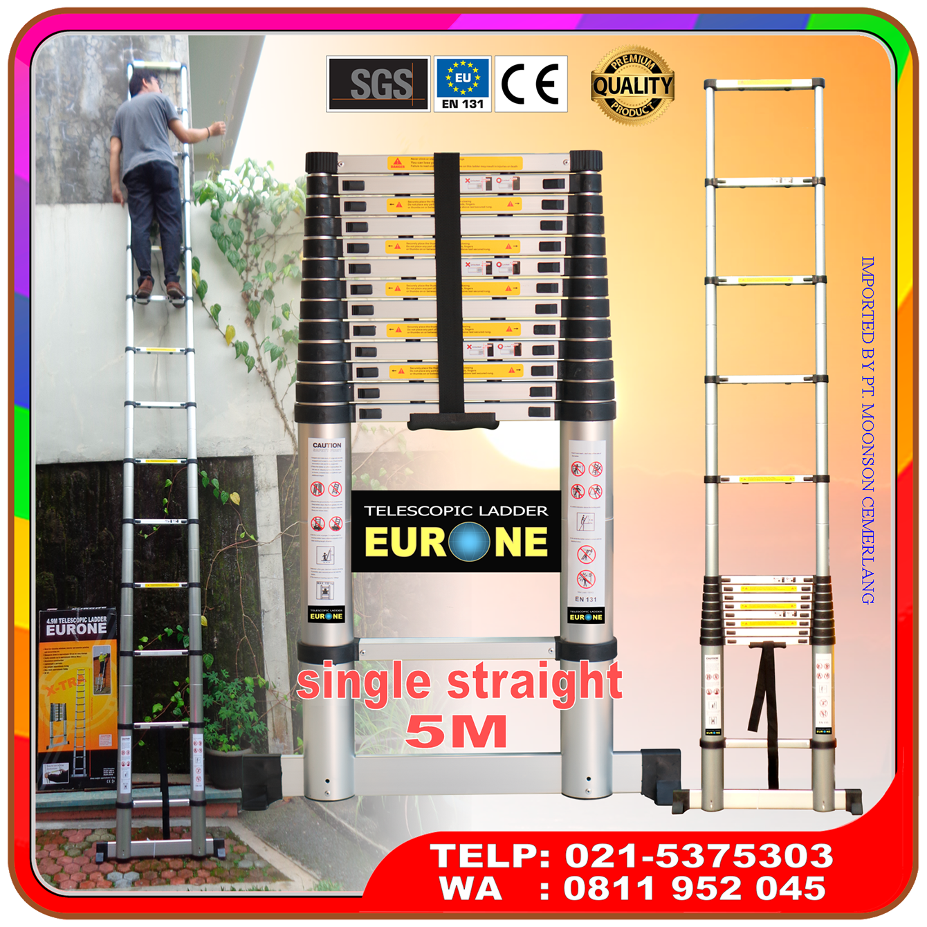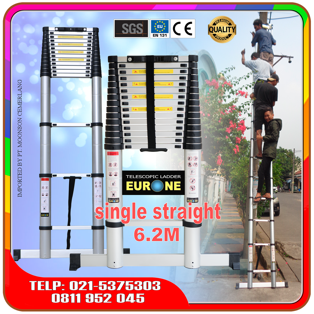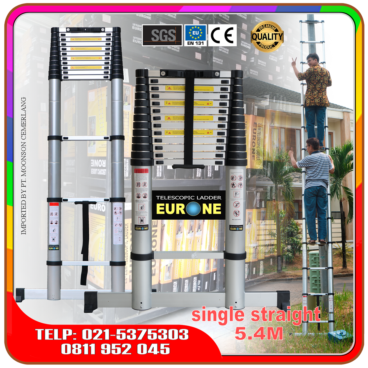 Nah, untuk lebih jelas mengenai tangga telekom atau teleskopik lurus ini, silahkan saksikan video berikut. Video menyajikan salah satu ukuran tinggi maksimum, yaitu 5.4m, khususnya sebagai bahan referensi untuk melihat cara kerja tangga dan juga soal kekuatan dan keamanan.